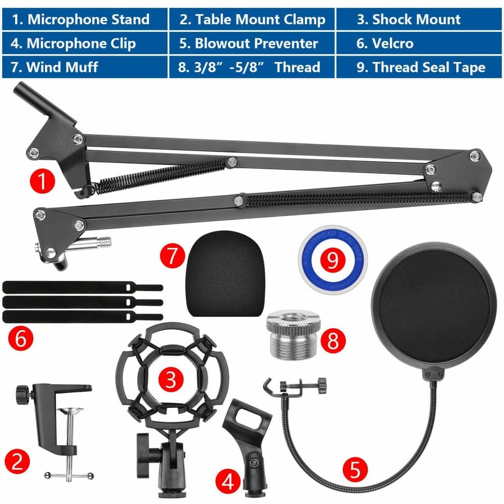 Audience-Building RecordingHow do you take your recordings from amateur to professional?You start by getting the right equipment!This boom scissor arm microphone stand is all you need to boost your confidence. So you can really focus on creating your brand and promoting your unique voice for all to hear.Perfect for live broadcasting, singers, podcasters, musicians, YouTubers, TikTokers, or professional gamers looking to build their platform! Helping you to create next level content your viewers will absolutely love!. Flexible, sturdy boom scissor arm holds your microphone stable during recording/streaming sessions . Easy angle adjustments, multi-directional arm folding with free 360-degree rotation . Standard compatible screw sizes (3/8 – 5/8”) for universal attachments . Isolates external sound and interruptive vibrations from environment- physical vibrations, floor and stand noise- to offer the purest sound experiences, without any irritating distractions in the home or office studio . Enhance your sound recording and streaming to promote your brand- perfect for live broadcasters, singers, musicians, YouTubers, gamers, TikTokers, etc.. Colour: Black . Material: Metal . Compatibility: Blue Yeti, Standard MicrophonesWhat do you get?1 x Microphone Scissor Arm Stand 1 x Table Mounting Clamp 1 x Adjustable Shock Mount 1 x Double Layer Pop Filter 1 x Screw Adapter 1 x Cable Tie 1 x Microphone Foam Cover