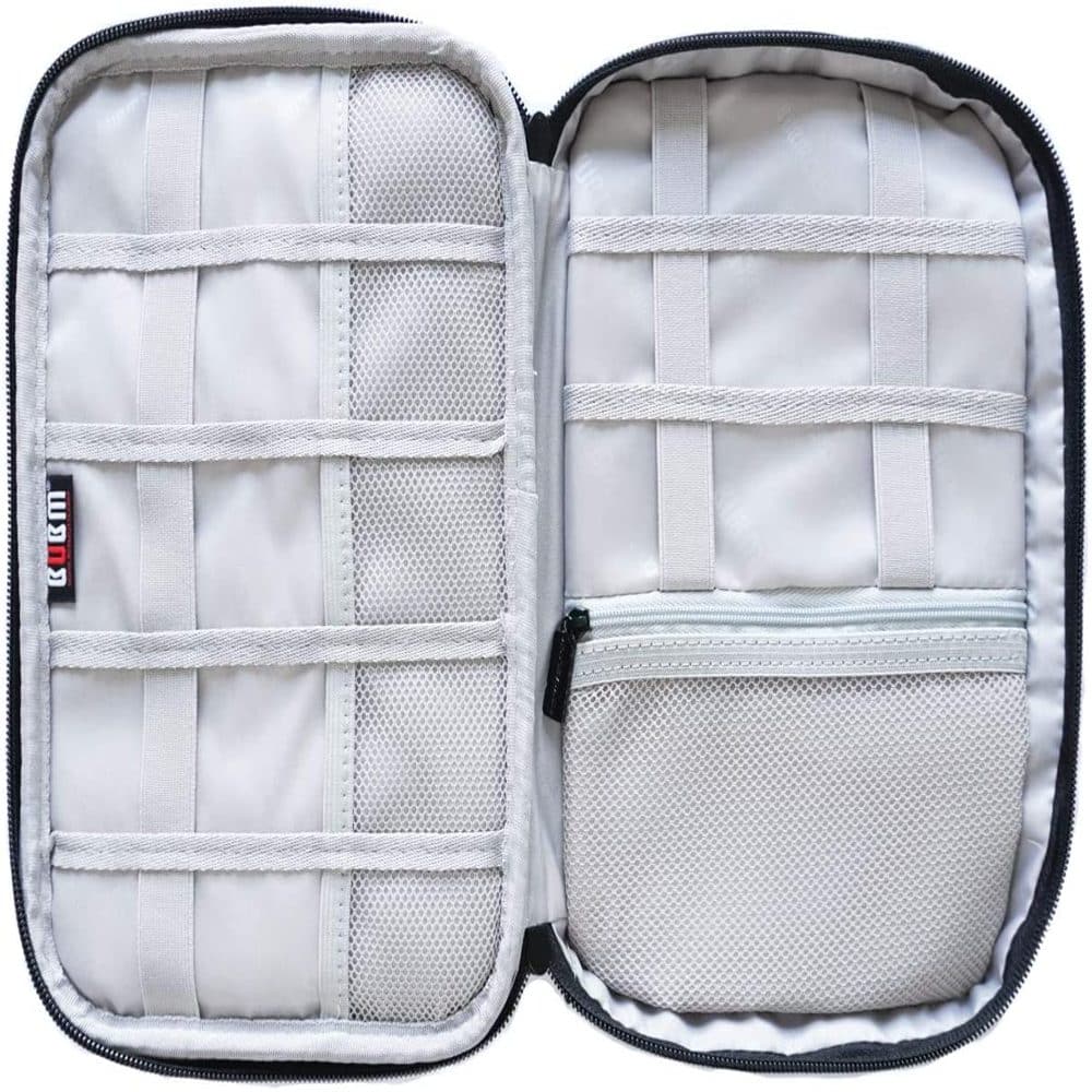 The bottom zone is for bulkier devices. It has walled-off compartments made of shockproof padding. Each area acts as a thick cushion along the journey, preventing collisions and scratches. The upper zone has multiple areas made up of mesh and elastic for all your cables, USBs, and smaller components.