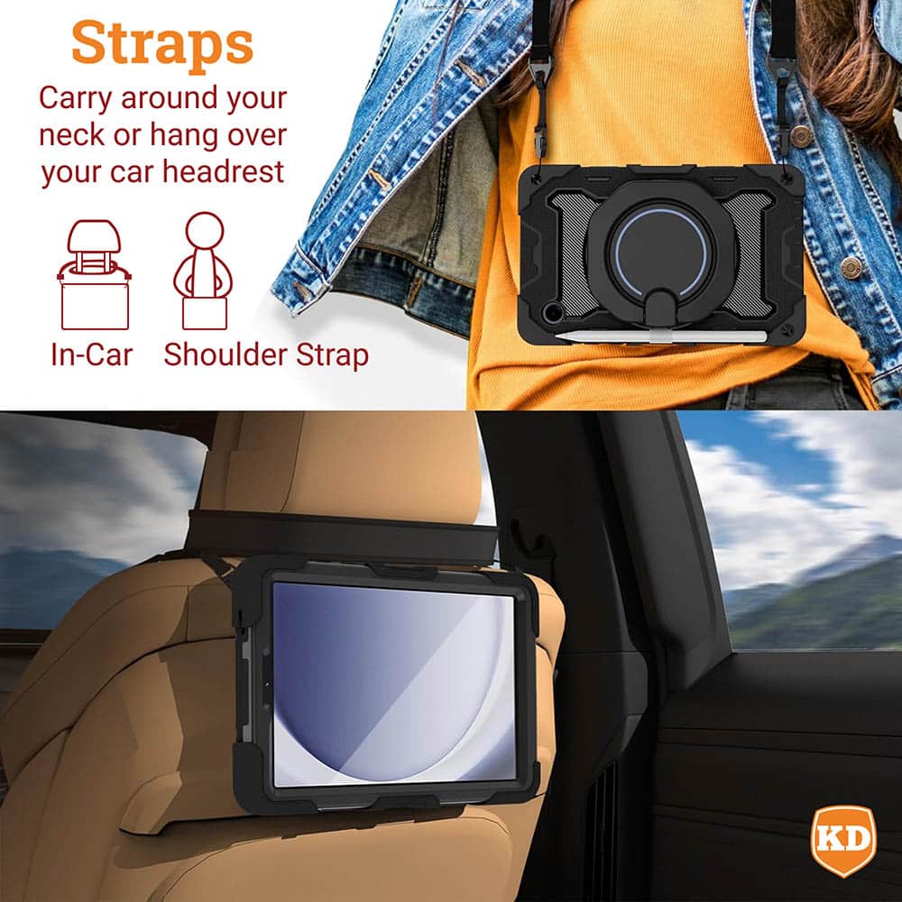 Protect Your iPad 10.2If you’re looking for rugged, durable protection for your device- then this is the protective cover for you.Designed with reinforced, shock-absorbing bumper corners to provide full body protection against bumps, accidental drops, and scrapes.It also features a swivel kickstand that lets you position your tablet at virtually any angle for easy viewing, a carry handle, and a reinforced strap.Choose quality and functionality- get yours today!. Durably made from hard PC and soft silicone material . A sturdy, rotary, swivel kickstand for portrait or landscape viewing . Adjustable angles to conveniently use your tablet for watching or typing . Shock-absorbing bumper corners provide reinforced, full body protection . Has a carry handle and strap for multifunctional transport- you can hang your tablet onto the back of your car’s headrest for easy, on-the-go viewing for passengers . Prevents dust build-up and provides easy access to all ports, speakers, and functions. Colour: Black . Material: PC & Silicone . Compatibility: iPad 10.2″ 2019/ 2020/ 2021What do you get?1x Tablet Protective Cover1x Carry Strap1x Tool 1x User Manual